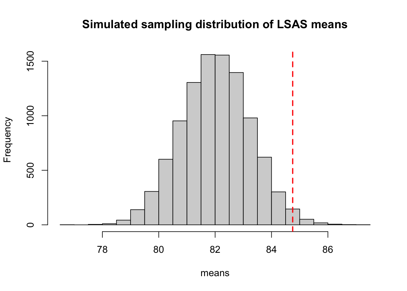 For instance we might have an hypothesis the the mean of LSAS-SR is 82 in the population. We can determine how probable our data would be under this hypothesis, by investigating how often we would expect to get our observed sample mean if this (null)hypothesis was true.