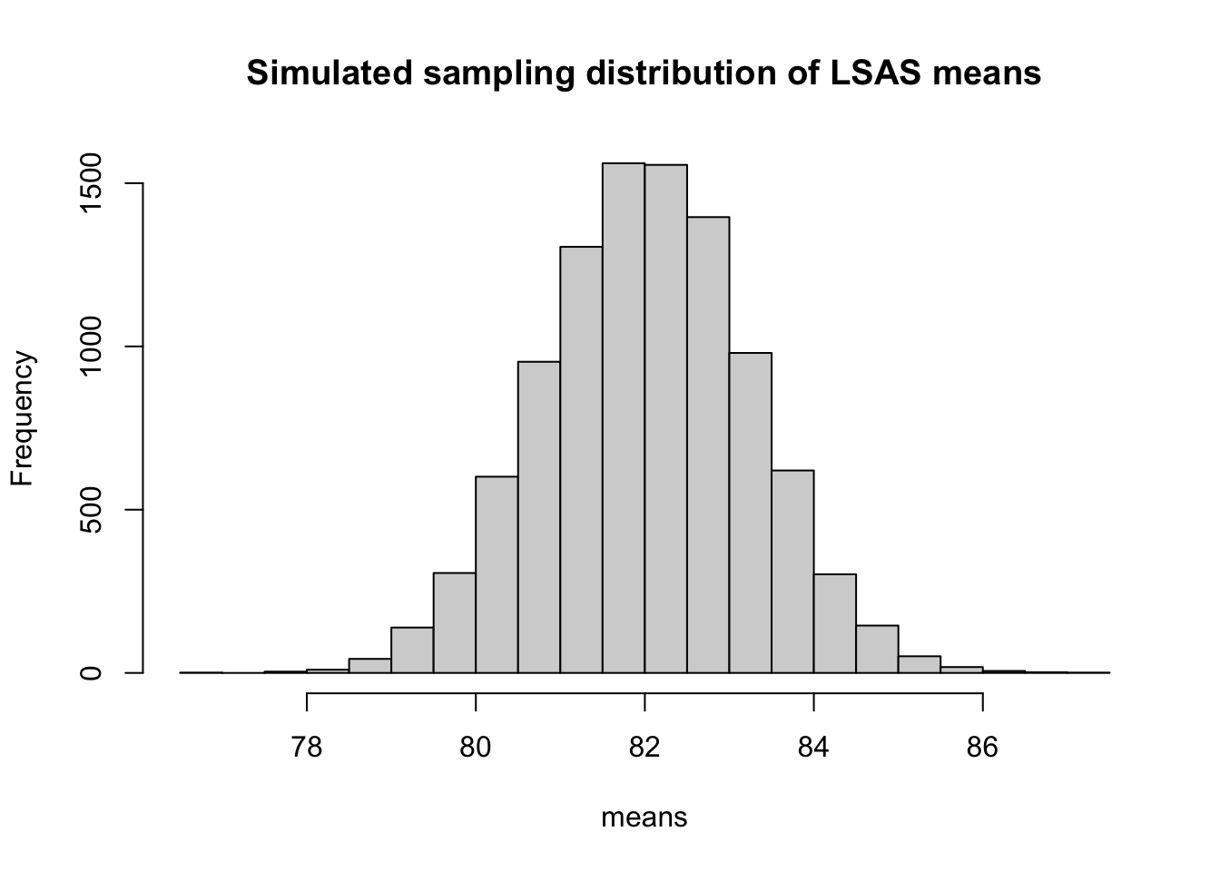 hist(means, main = "Simulated sampling distribution of LSAS means")