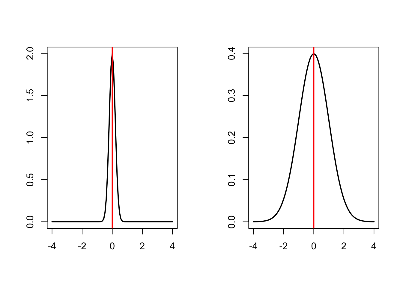 Centrality measures give information on the most typical value in the distribution, but no info on the spread of values. For example, the two distributions below have the same mean value (0), but different spread (standard deviation 0.2 vs. 1).