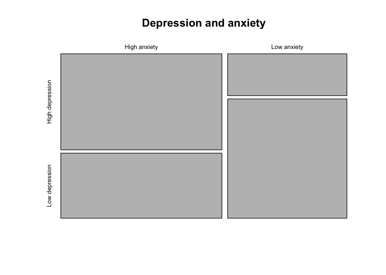 Although all information about the distribution is available in the crosstable, you may still want to visualize this distribution. One way is to use a mosaic plot, which you can get by providing cross-table to the plot() function.
