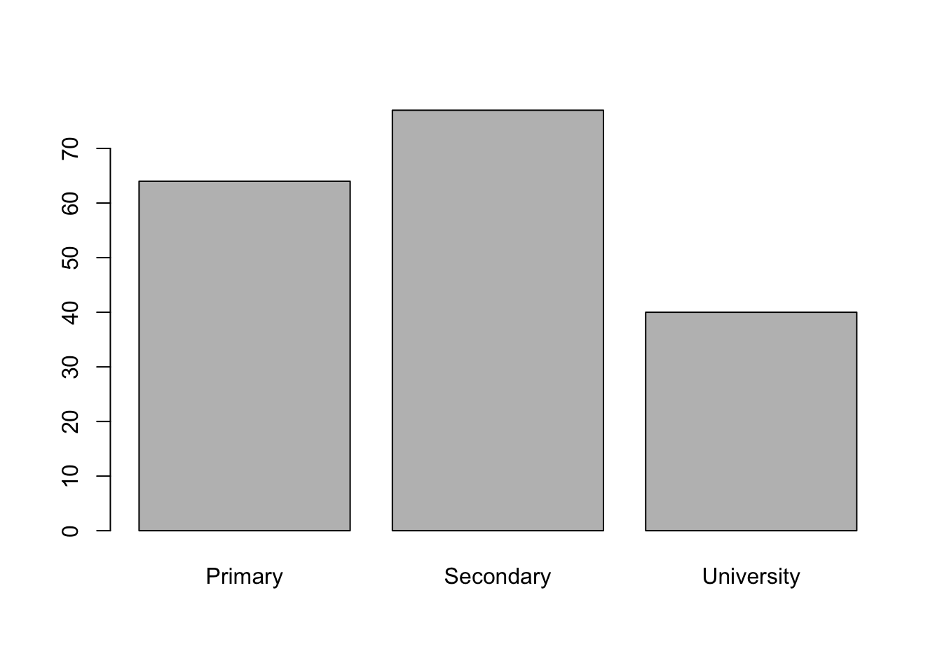 The height of each bar gives the number of occurrences of each category. When you use the base function plot() on a factor level variable, it gives you a barchart.