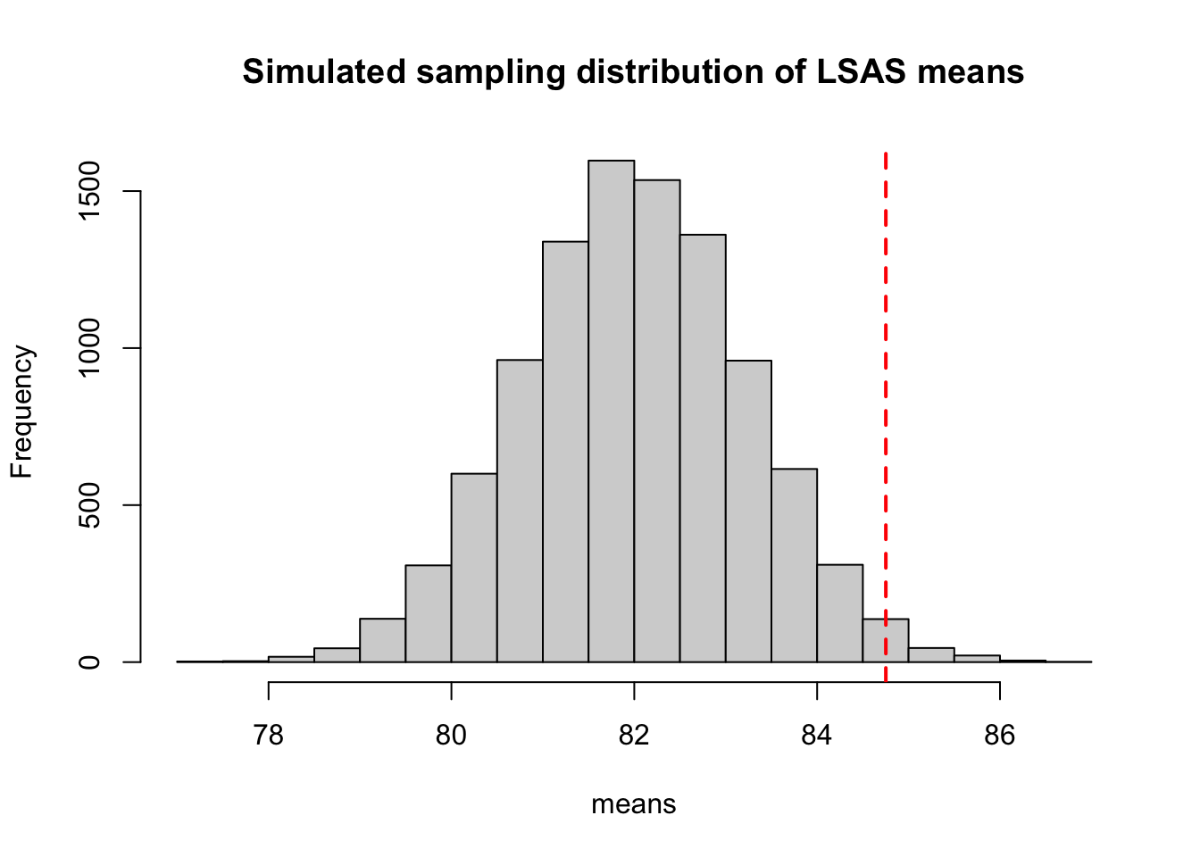 We can use this simulated sampling distribution to see how probable our observed LSAS-SR mean is if the (null)hypothesis that the true mean is 82 would be correct. First let plot the sampling distribution again, and show the observed LSAS-SR mean as a vertical line.
