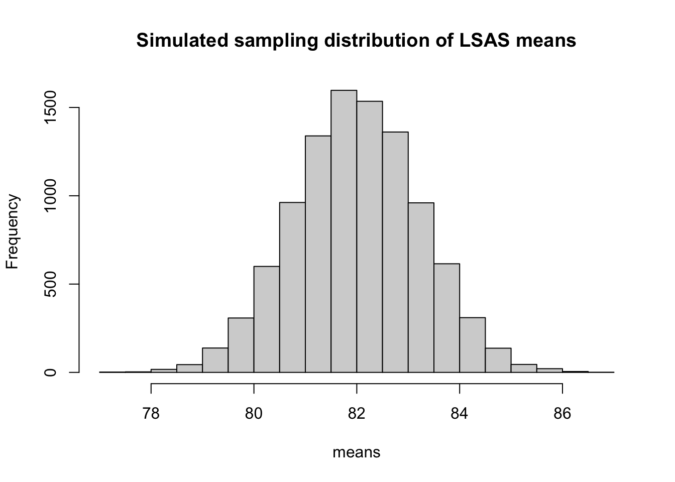hist(means, main = "Simulated sampling distribution of LSAS means")