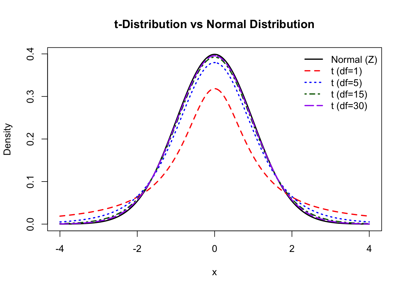 lines(x_range, dt(x_range, df = 30), col = "purple", lwd = 2, lty = 5)