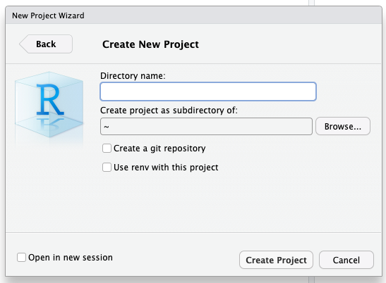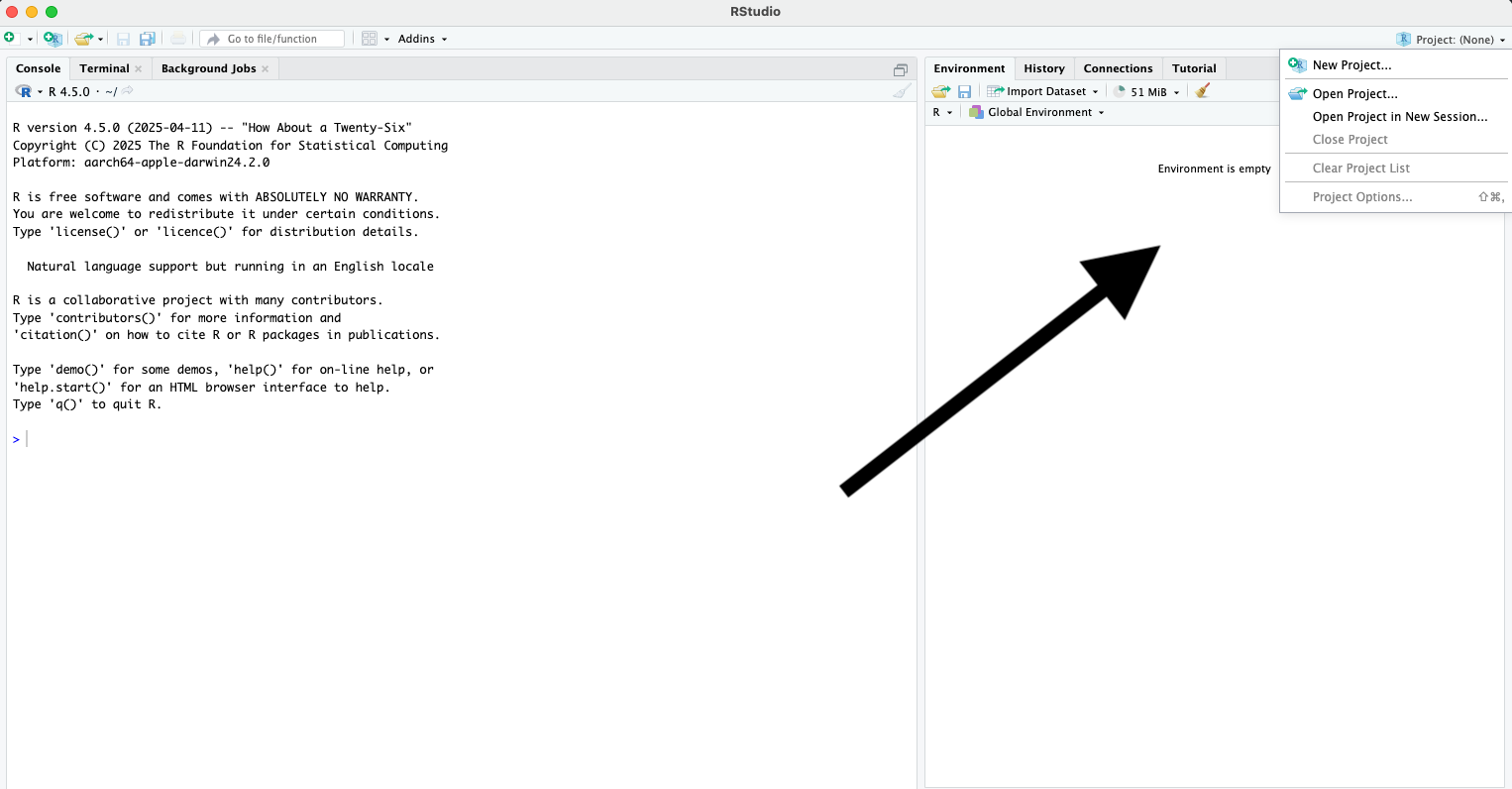 RStudio projects are a great way to organize your work. They allow you to keep all your files, data, and code in one place, making it easier to manage your projects. To create a new project, go to the upper right corner where it says “Project: (None)”. Then choose a location for your project and give it a name (maybe biostat-labs 🤓).