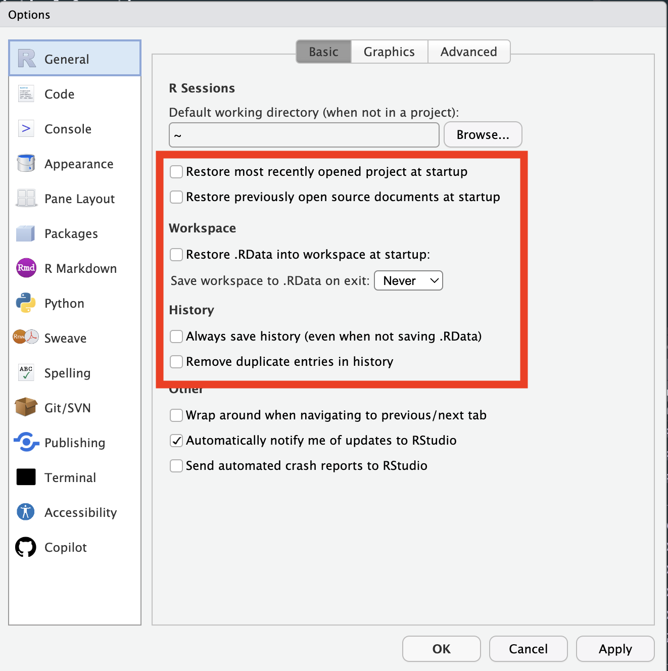 There are a few things we want you to change in the default RStudio settings. To access the settings in RStudio, go to Tools -> Global Options... in the menu bar or press Cmd + , (Mac) or Ctrl + , (Windows/Linux). Then navigate to the General tab. Make sure to set the options according to the image below:
