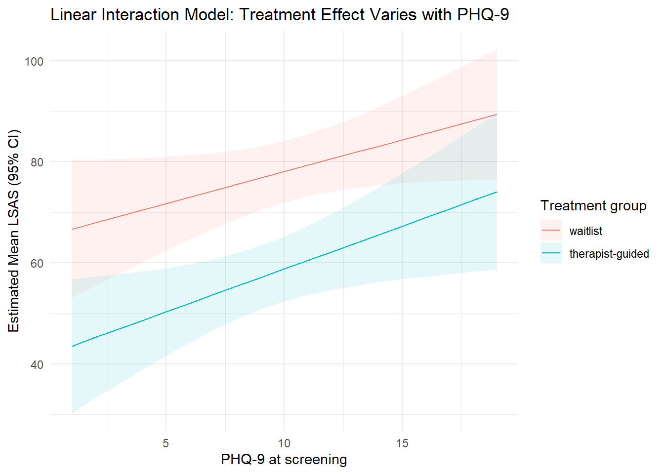 title = "Linear Interaction Model: Treatment Effect Varies with PHQ-9"