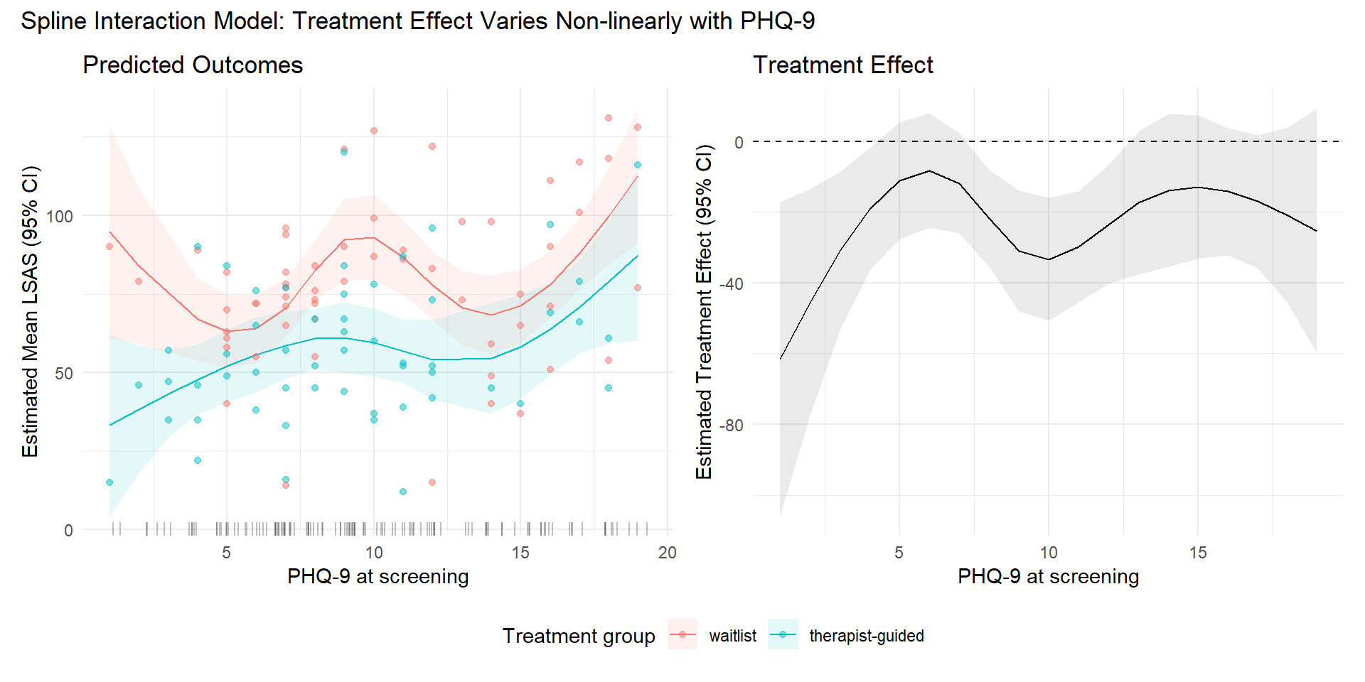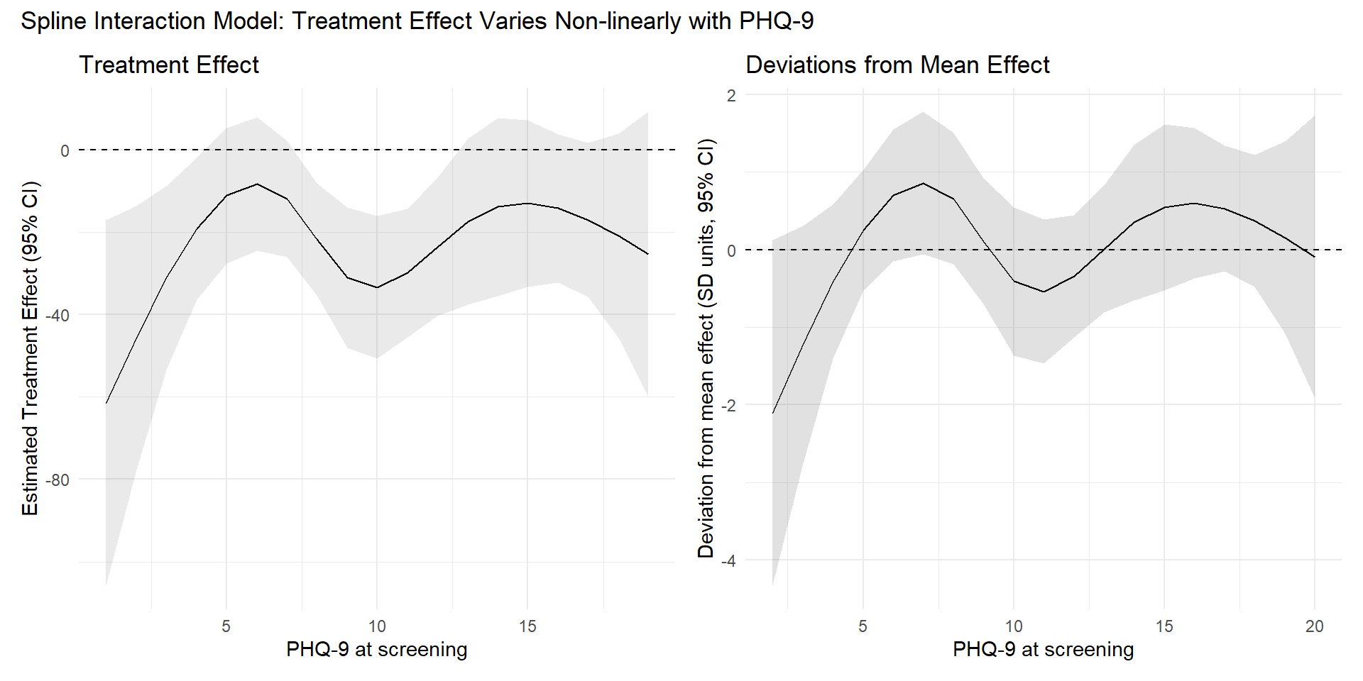 So far it does not seem like there is a substantial effect of baseline PHQ-9 scores on the treatment effect. However, it is possible that the effect varies non-linearly. We can investigate this by modeling PHQ-9 scores using a natural cubic spline.