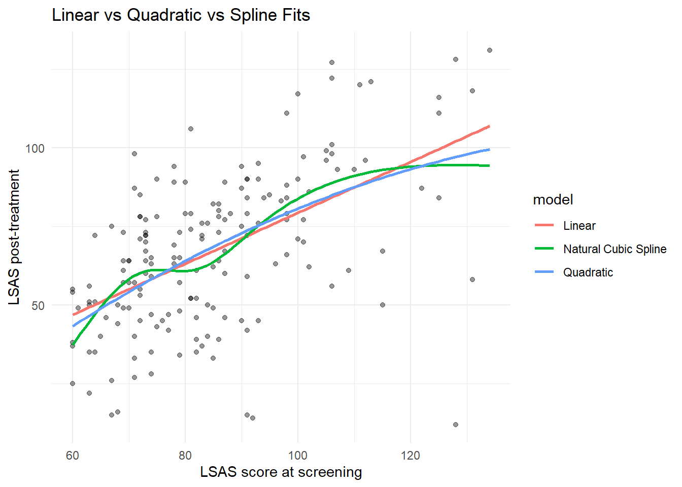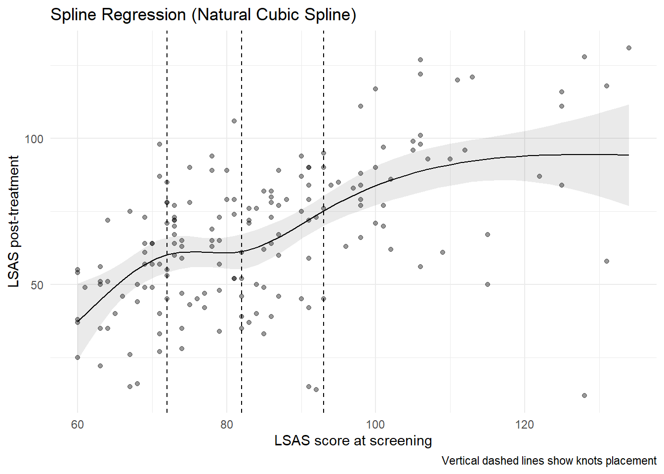 Using splines, the model is written as: \[ \mathbb{E}(LSAS_{post} \mid lsas\_screen) = \beta_0 + f(lsas\_screen) \] where \(f(\cdot)\) is a smooth function estimated from the data. In practice, splines approximate \(f\) with a set of piecewise cubic polynomials that are joined at a small number of locations called “knots.” The pieces are constrained to join smoothly, typically ensuring the function and its first two derivatives are continuous across knots. This allows the curve to adapt to local patterns without imposing a single global shape.