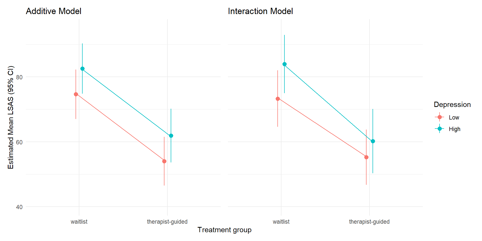 Here we see the difference between the additive and the interaction model clearly. Since the additive model assumed additivity, the lines are exactly parallel (i.e., the treatment effect is the same for the low vs high depression group). In the interaction model, we have allowed the treatment effects to differ by depression level, and we see that the high-depression group improves more than the low depression group.